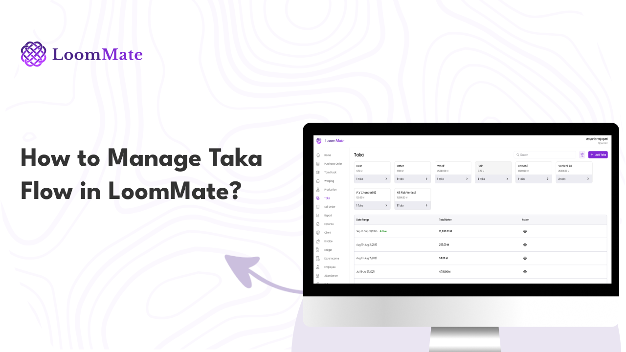 How to Login and Access Dashboard in Loommate? In textile operations, every taka (fabric roll) matters. LoomMate’s Taka Flow feature helps you track each roll, from production to sales, so you can maintain complete control over your inventory and avoid confusion. Video Walkthrough (Watch the video below for a complete step-by-step tutorial. Prefer reading? Continue with the guide.) https://loommate.com/wp-content/uploads/2025/09/Taka-Flow.mp4#t=,12 Step-by-Step Guide to Managing Taka Flow Step 1: Open the Taka Flow Section From the Dashboard, go to Production → Taka Flow. Click on + Add New Taka to start. Step 2: Enter Taka Details Fill in the following information: Loom / Machine Number Taka Number (auto-generated or manual) Fabric type / Yarn type Length (in meters or yards) Weight (optional) Step 3: Assign Status Select the current status of the taka, such as: In Production Ready for Inspection Approved Ready for Sale Step 4: Save the Taka Record Click Save & Continue to store the entry. The taka will now appear in your Taka Flow Dashboard. Step 5: Track Movement From the dashboard, you can monitor the movement of each taka: Production → Inspection → Warehouse → Sales. Update status as the roll moves through each stage. Troubleshooting Tips Duplicate Taka Number? Make sure each roll has a unique ID. Wrong entry? Use the Edit option before finalizing. Missing data? Ensure machine number and length are entered correctly to avoid mismatches. Next Steps Now that you know how to manage Taka Flow in LoomMate, you can: Link takas with Sell Orders for accurate stock updates Generate Reports to see production vs. sales performance Continue learning with our next guide: How to Add a Yarn Company in LoomMate